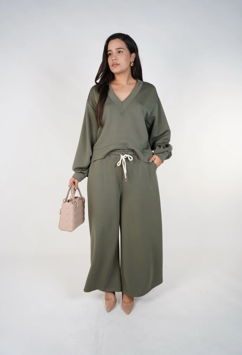 The Alessandra Lounge Set is the definition of effortless Italian chic. Crafted in Italy, this ultra-comfortable yet polished matching set features a relaxed V-neck long-sleeve top paired with flowy wide-leg pants and an adjustable drawstring waist. Designed in a soft, elevated fabric with a flattering drape, this one-size set transitions seamlessly from everyday errands to casual dinners or travel days. Wear it together for a clean, coordinated look or style each piece separately for endless versatility.