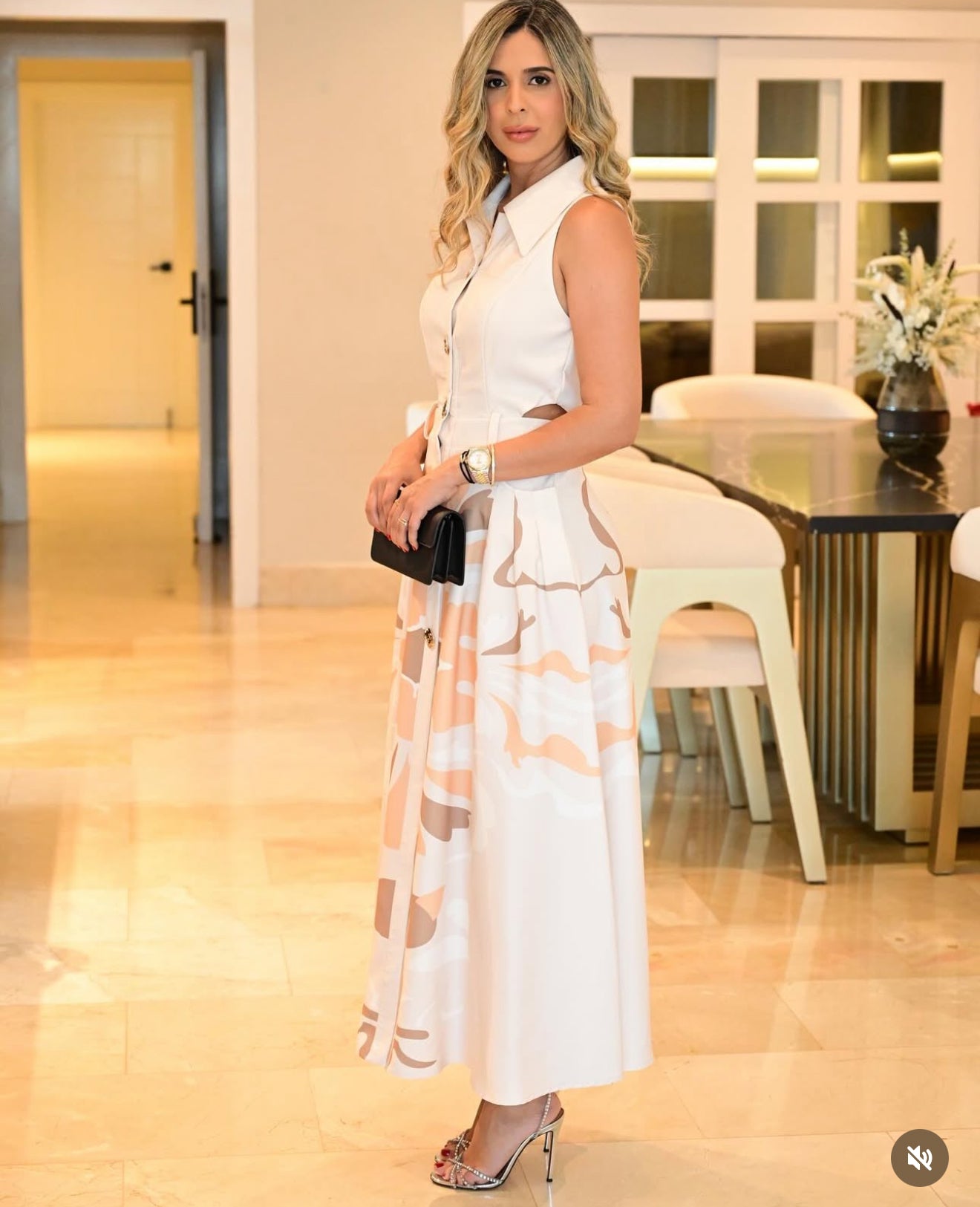 Gold-tone statement buttons run down the front, adding a luxe touch, while subtle side cut-outs offer a contemporary flair without compromising elegance. The midi-length skirt flows gracefully, making it perfect for upscale luncheons, resort evenings, or garden parties.