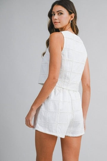 Keep it effortlessly polished with the Ariel Short Set, a crisp and timeless two-piece designed for easy, everyday elegance. Featuring a textured woven fabric with subtle grid detailing, this set blends structure with softness for a refined yet relaxed look.