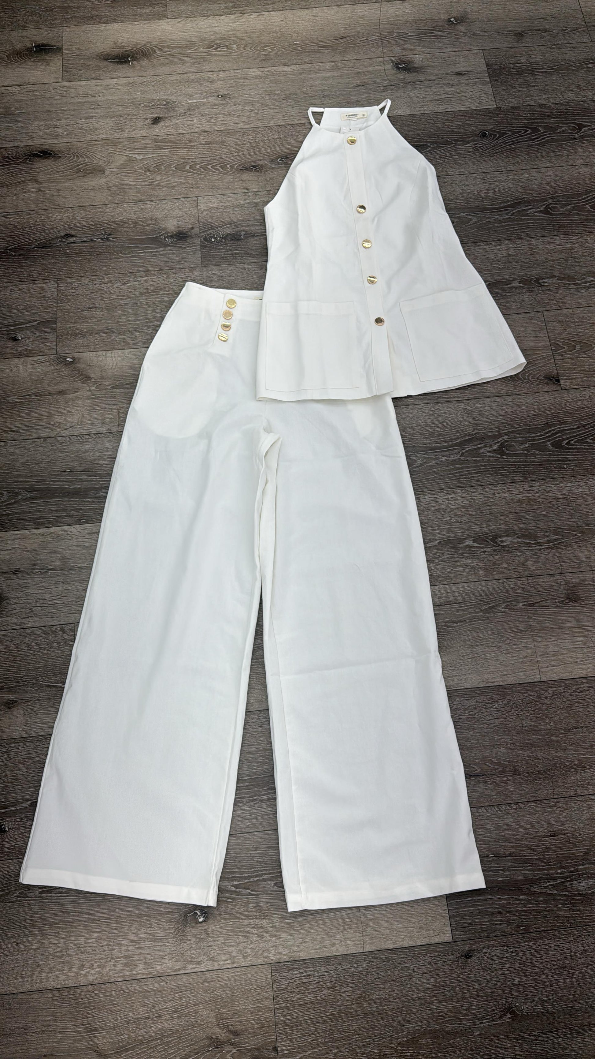 The coordinating wide-leg pants flow gracefully with every step, creating a refined yet relaxed look. Lightweight and breathable, this set is perfect for warm weather while still delivering a polished finish. The functional front pockets and gold button details add subtle structure and luxury touches.