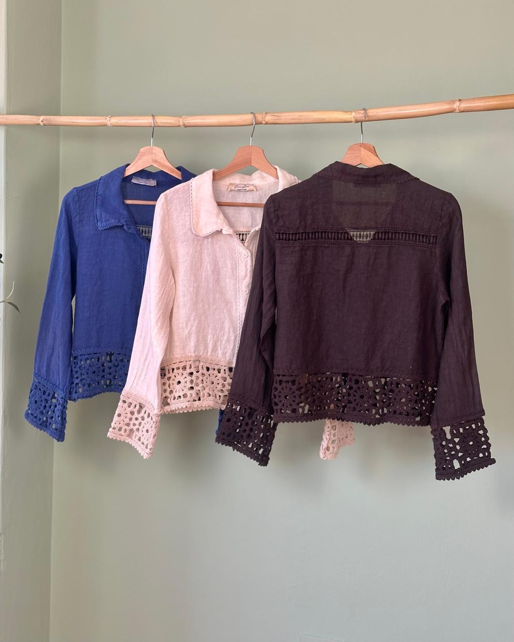 Both pieces are finished with intricate crochet lace trim along the cuffs and hems, adding a touch of femininity and artisan charm. Lightweight, breathable, and naturally textured, this set is perfect for warm-weather days, travel, or resort evenings.