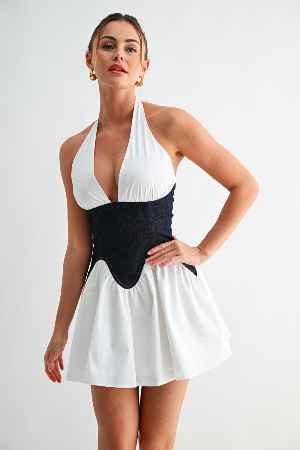 The Eve Mini Dress is the perfect blend of flirty femininity and modern structure. Designed with a flattering halter neckline and open back, this mini features a sculpting denim-inspired bodice that cinches the waist beautifully, flowing into a playful gathered skirt. Crafted from a soft yet structured cotton blend with a touch of stretch, it offers comfort while holding its shape. Effortless, chic, and eye-catching—this is your go-to piece for warm days and stylish nights.