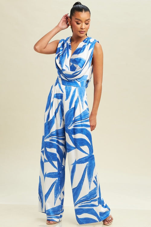 A statement-making one-piece splashed in bold cobalt palms over crisp white. The fluid, lightweight fabric drapes into a double cowl neckline that mirrors a dramatic open back, finished with an adjustable tie at the nape. A defined waistband flows into pleated, wide-leg trousers that skim the floor for elongating movement.