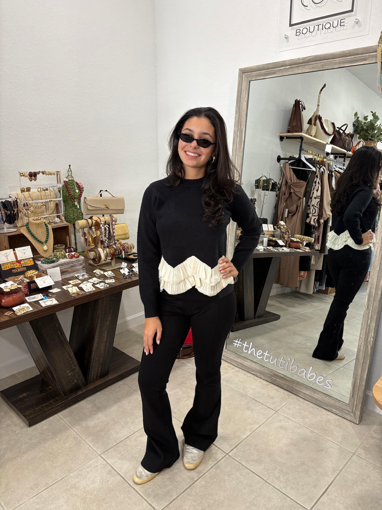 he Malaga Sweater brings playful elegance to cozy season dressing. Crafted from a soft and durable blend of 52% acrylic, 28% polyamide, and 20% polyester, this knit features a contrasting ruffle detail that adds a feminine twist to its classic silhouette. The neutral tones make it effortlessly chic — perfect for pairing with jeans, trousers, or skirts for an elevated everyday look.