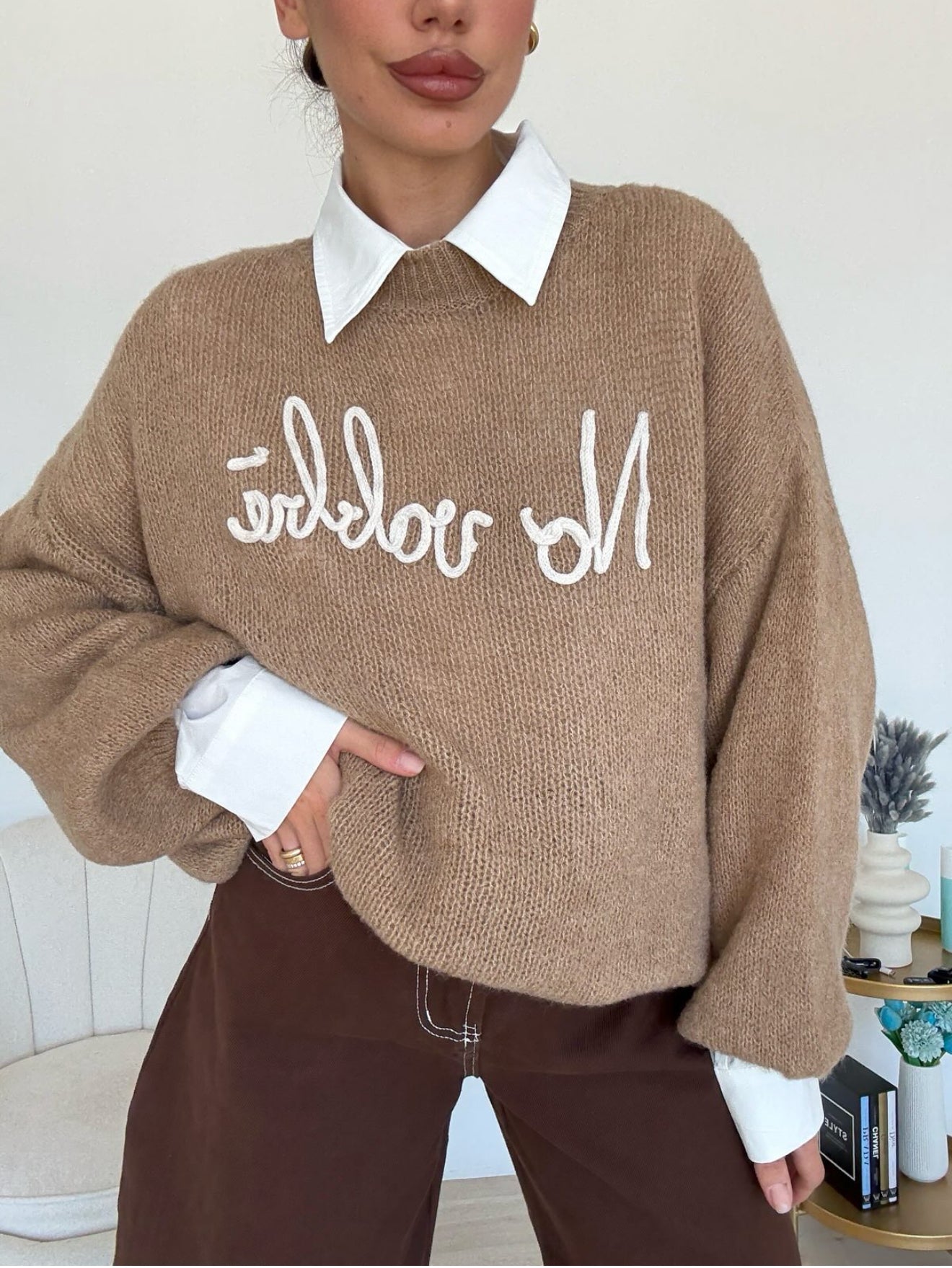Whether you pair it with denim, leather, or lounge bottoms, this sweater brings personality and warmth to any outfit. A must-have for chilly days, coffee runs, or those “No Vabbè…” moments.
