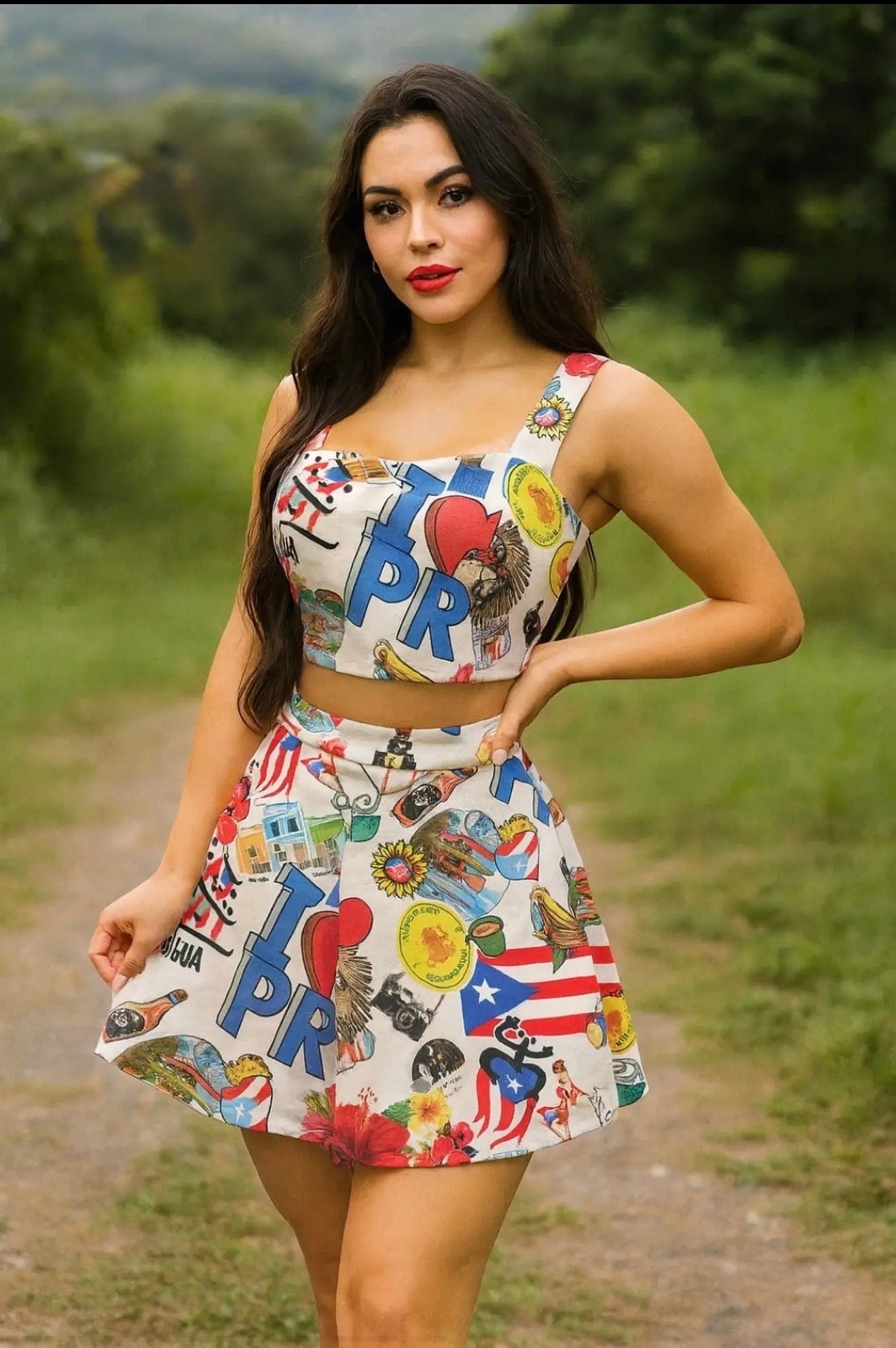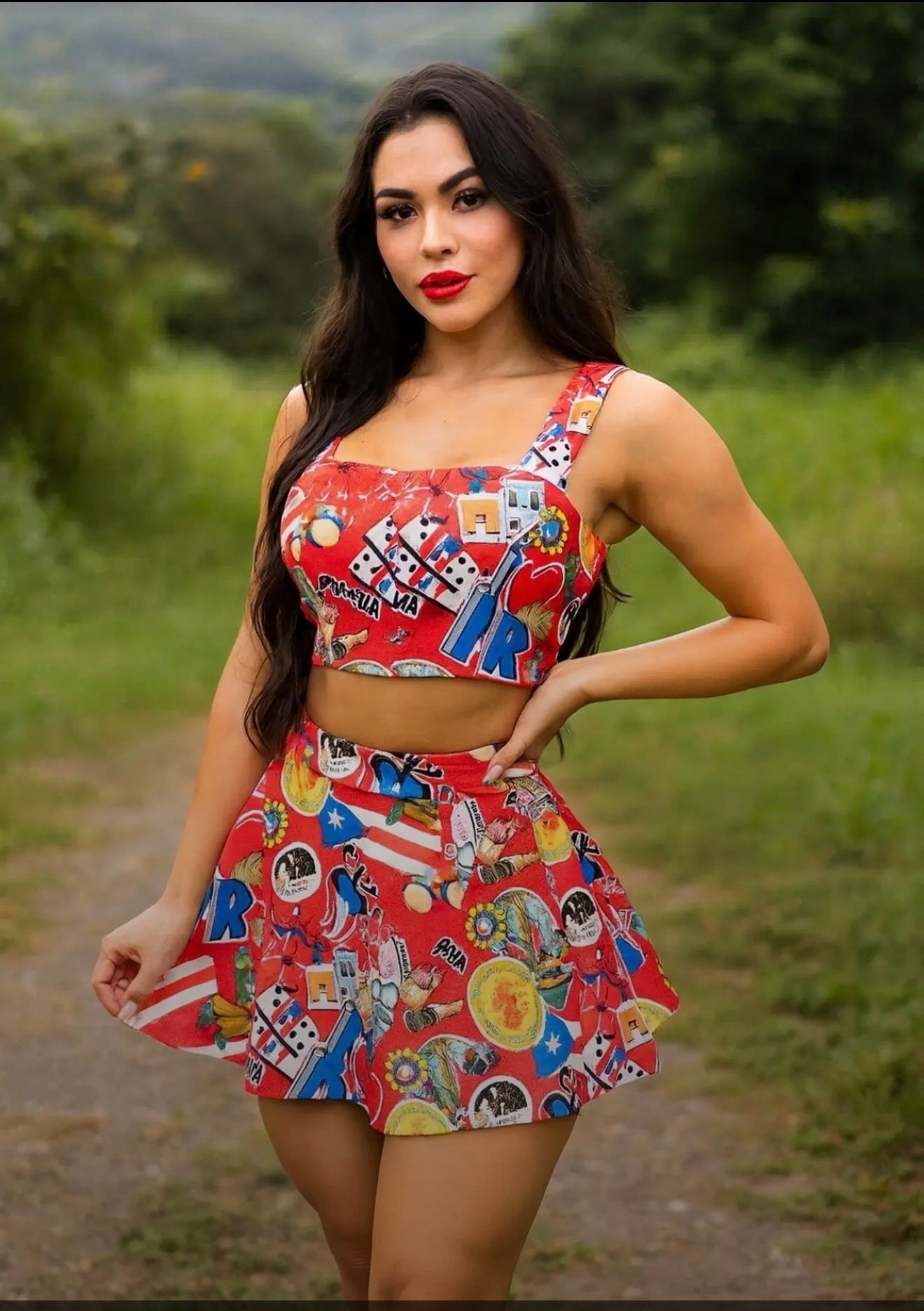 The Wella Top is a bold and playful statement piece celebrating Puerto Rican culture and flair. Designed in a vibrant red base with iconic PR-inspired graphics, this cropped top features a flattering, structured silhouette that highlights the waist while offering comfortable stretch. Crafted from a soft and flexible 95% Polyester and 5% Spandex blend, it moves with you effortlessly while keeping you stylish and confident. Perfect for festivals, casual outings, or tropical getaways, the Wella Top brings energy, pride, and personality to your look—especially when paired with the matching skort.